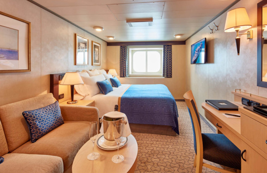 Gaze upon an ever changing seascape from your large window, which offers an abundance of natural light in your spacious stateroom. The Britannia Oceanview staterooms have two beds, a living area and a shower.