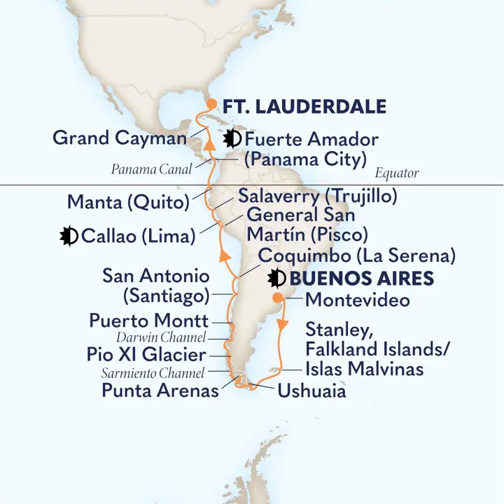 Experience the Latin passion of Buenos Aires as you embark on the ultimate South American adventure — from the fabulous birdlife of the Falklands and Chile’s maze of massive glaciers, to the rich history of Peru and the mighty locks of the iconic Panama Canal. Enjoy more time ashore with overnight stays in Argentina, Peru, and Panama.