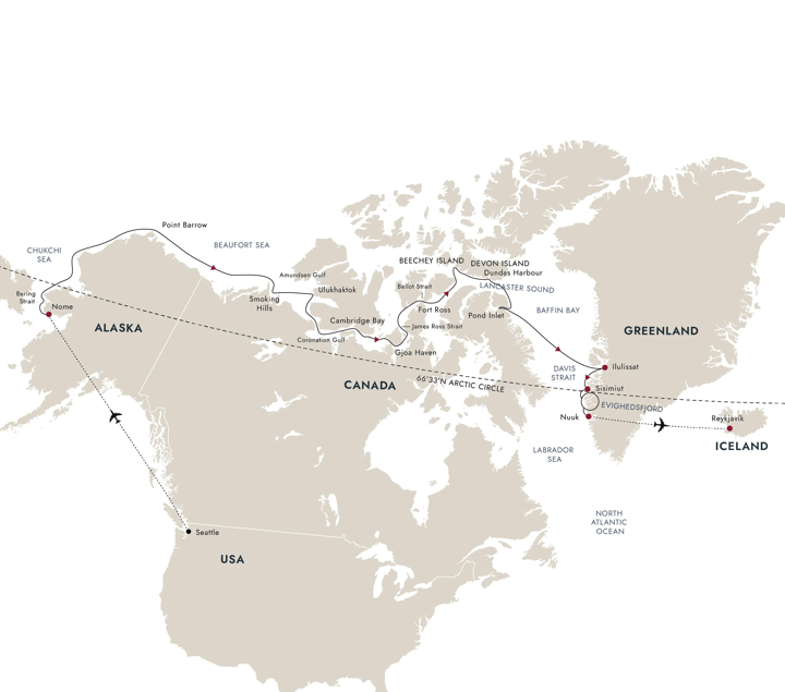 Our 26-day voyage takes us ‘above’ the North American continent to the frozen far north. As we head up from Alaska through the famed Beaufort Sea and Bering Strait, we pass into the Western Arctic Canada where we’ll explore the western section of the Northwest Passage. From here on in, it’s pure expedition as we transit to Eastern Arctic Canada where you’ll experience a pristine and remote wilderness featuring surreal vistas of frozen sea ice. We then emerge into Baffin Bay and sail to West Greenland, where you’ll encounter natural beauty like nowhere else.