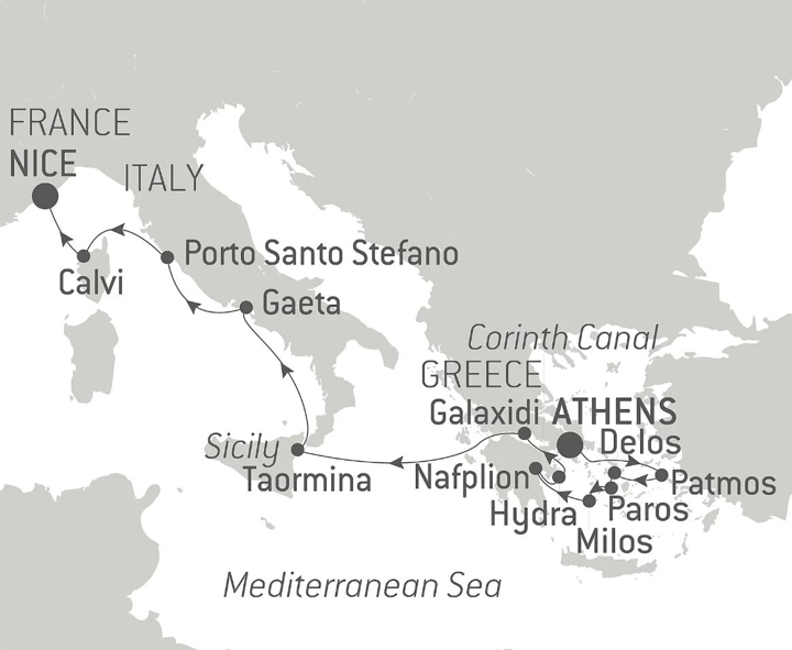 From the Cave of the Apocalypse and the charming hilltop town of Taormina, to the archaeological treasures of Delos, the spectacular Corinth Canal, and the ancient, picturesque city of Gaeta — experience the enchanting allure of the Mediterranean!
