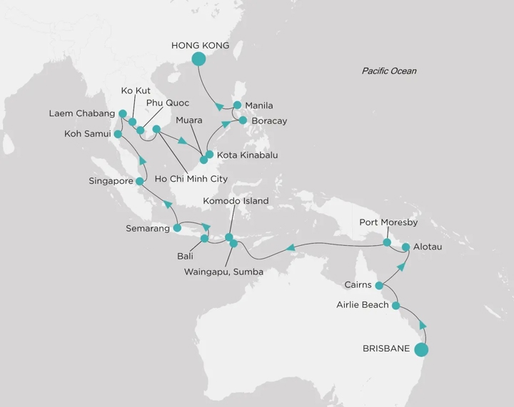 18 Mar 27 – 23 Apr 27 -  36 nights BRISBANE to HONG KONG