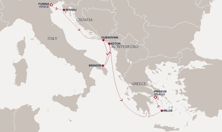 Sail through the Adriatic and Aegean as you journey from Venice to Athens. Explore the Venetian charm of Rovinj, the walled treasures of Dubrovnik, and the historic streets of Brindisi. Take in the dramatic beauty of Kotor’s bay and the serene landscapes of Milos before arriving in vibrant Athens, where ancient history meets modern life.