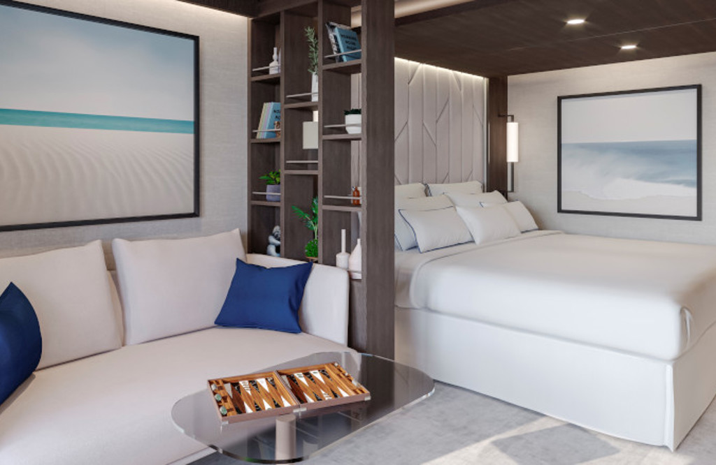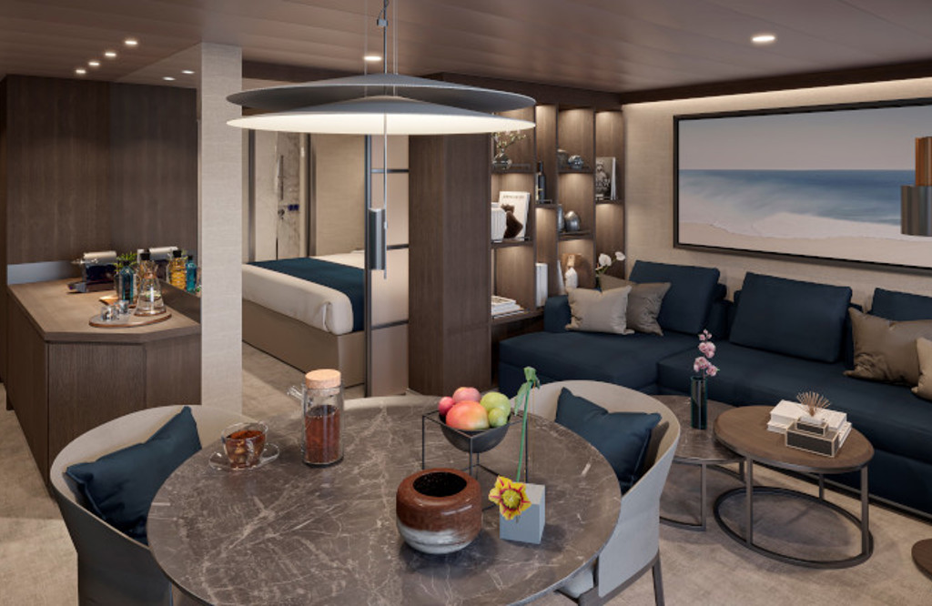Our Ocean Terrace Suites are amongst the largest entry-level suites in the industry. Each one has floor-to-ceiling windows, and a private sun terrace featuring a dining table and a daybed, allowing guests to feel closer to the ocean as it carries them on their journey.
