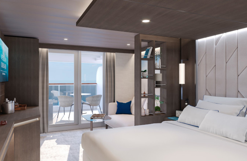 Our Ocean Grand Terrace Suites are situated on decks 6 and 7, offering a more spacious private sun terrace featuring a dining table and a daybed, allowing guests to savour the ocean from the comfort of their daybed.