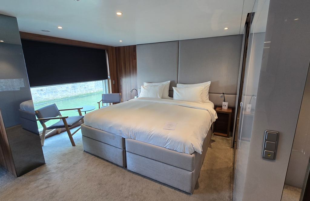 Separate bedroom and lounge area, Queen-size or twin hotel-style beds, Pillow menu, En-suite bathroom with shower, indulgent toiletries, hair dryer, on-board complimentary bathrobes and slippers, Walk-in wardrobe, Complimentary in-suite mini- bar, restocked daily with wine, beer and soft drinks, Complimentary Nespresso machine, Continental breakfast, pre-dinner canapés and after-dinner sweet treats served in your suite, Four items of laundry per day, Invite to dinner at the Captain’s Table