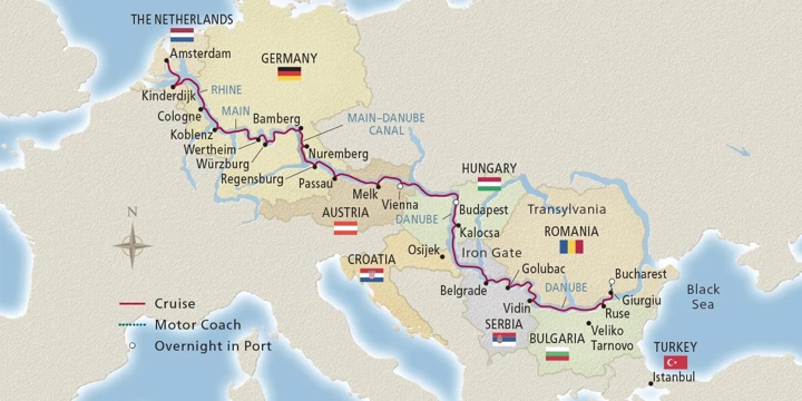 As far back as 1,200 years ago, visionary Frankish Emperor Charlemagne contemplated connecting the Rhine, Main and Danube Rivers so ships could travel the length of Europe. Today, his dream dramatically comes to life. The Main-Danube Canal employs 16 stair-step river locks that allow vessels to travel 2,200 miles through 10 countries, from the North Sea coast of Holland to the Black Sea shores of Romania.