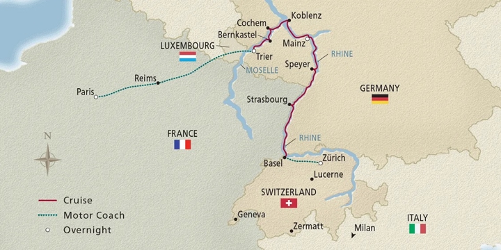 Savour the cuisine and culture of romantic Paris during a hotel stay before embarking on an unforgettable journey along the Moselle and Rhine. Discover Trier, Germany's oldest city, sample local wine in the charming town of Bernkastel-Kues, sail past hilltop fairytale castles along the Middle Rhine, a UNESCO Site, and sample Alsatian food in Strasbourg. Your voyage concludes with a hotel stay in Zurich where you can take in the impressive sights of Switzerland's stunning lakeside.
