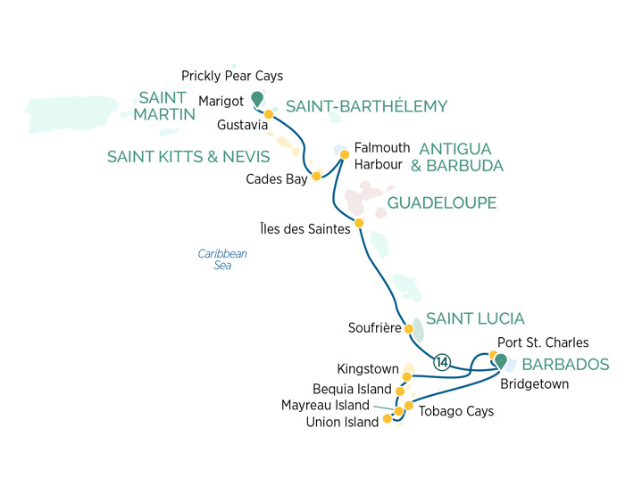 Your Emerald Cruises exciting Caribbean journey begins in Marigot, the capital of the island of Saint Martin. You’ll be transferred to your Emerald Cruises luxury yacht to begin an adventure into paradise.
