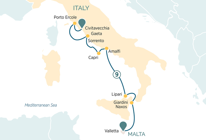 Set sail on an unforgettable 9-Night cruise through the treasures of the Mediterranean, starting in Italy, at the seaport of Civitavecchia – gateway to Rome, the ‘Eternal City’. Immerse yourself in ancient times at the archaeological sites in Gaeta and discover the beauty of the legendary island of Capri and incredible vistas of the Bay of Naples from Sorrento. Soak up rich history along the picturesque streets of Amalfi, relax on the pristine beaches of Lapari and explore the charming town of Giardini Naxos on the stunning island of Sicily. Whether you seek relaxation, adventure, historical wonders, or cultural immersions, this luxury cruise offers something for everyone.